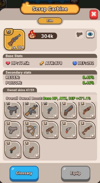 The stats that you see in this window are the Item stats. To see the Skin stats, tap on the Glossary button at the bottom and choose the skin you want to check: