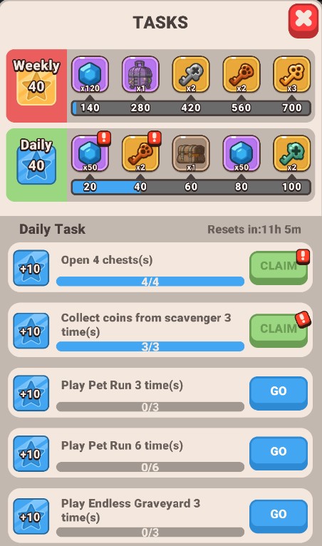 The Tasks menu is located on the main game screen and contains a list of daily quests. By completing these quests, you can earn additional rewards.