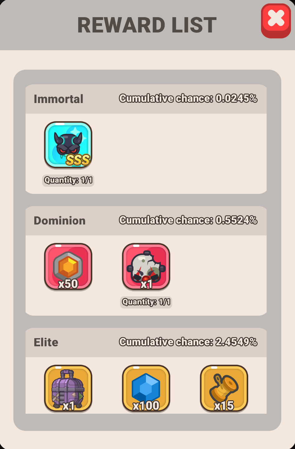- Immortal, Dominion, Hardened, Scrap, and Rusted are the types of rewards, not the rarity of the item received.