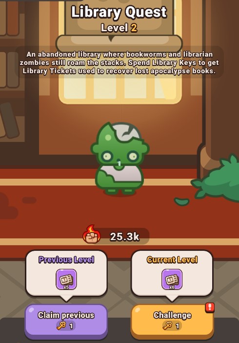 To attack the Zombie Boss, tap the Challenge button at the bottom of the screen. You will need 1 Library Key to initiate the attack.