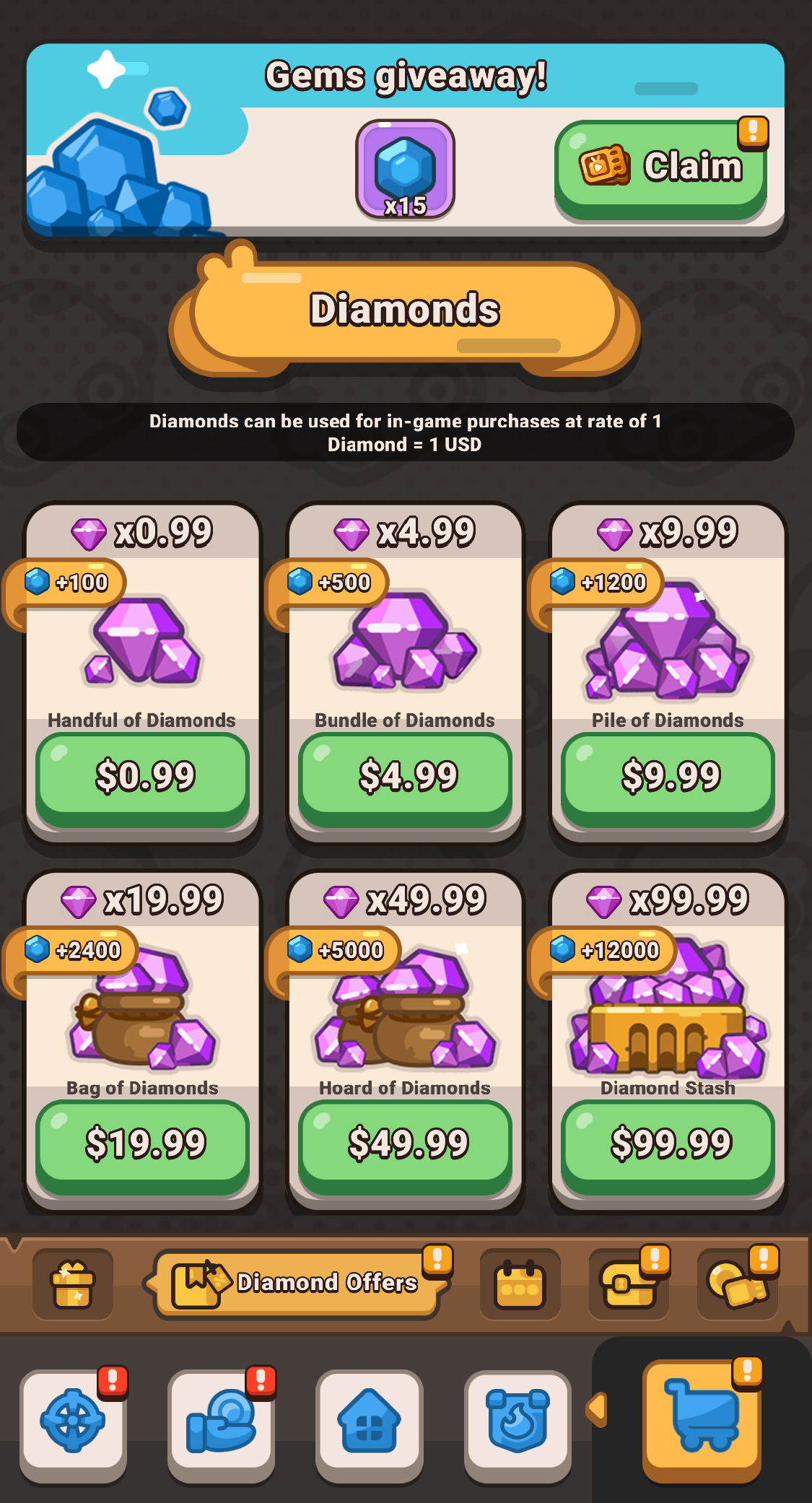 Here you’ll find: special offers, purchasable currencies, valuable bundles, and free daily rewards. Be sure to check in daily to claim your free bonuses!