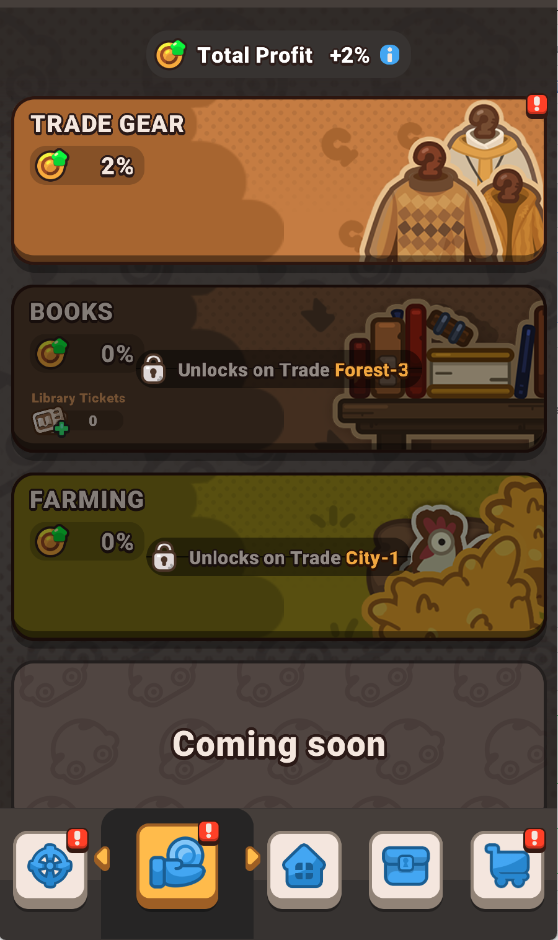 Has all the trading profit game modes in one place: Trade gear, Books, and Farming. These modes are centered around growing your Total profit rate and improving its efficiency in the Trade game mode.