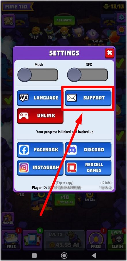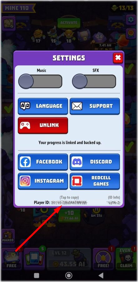 At the bottom of the settings screen, below the social buttons (Facebook, Discord, etc.), you’ll see your Player ID.