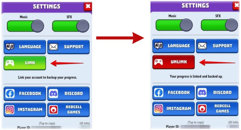 - Press the Link button and connect the game to your Apple ID or Google account.