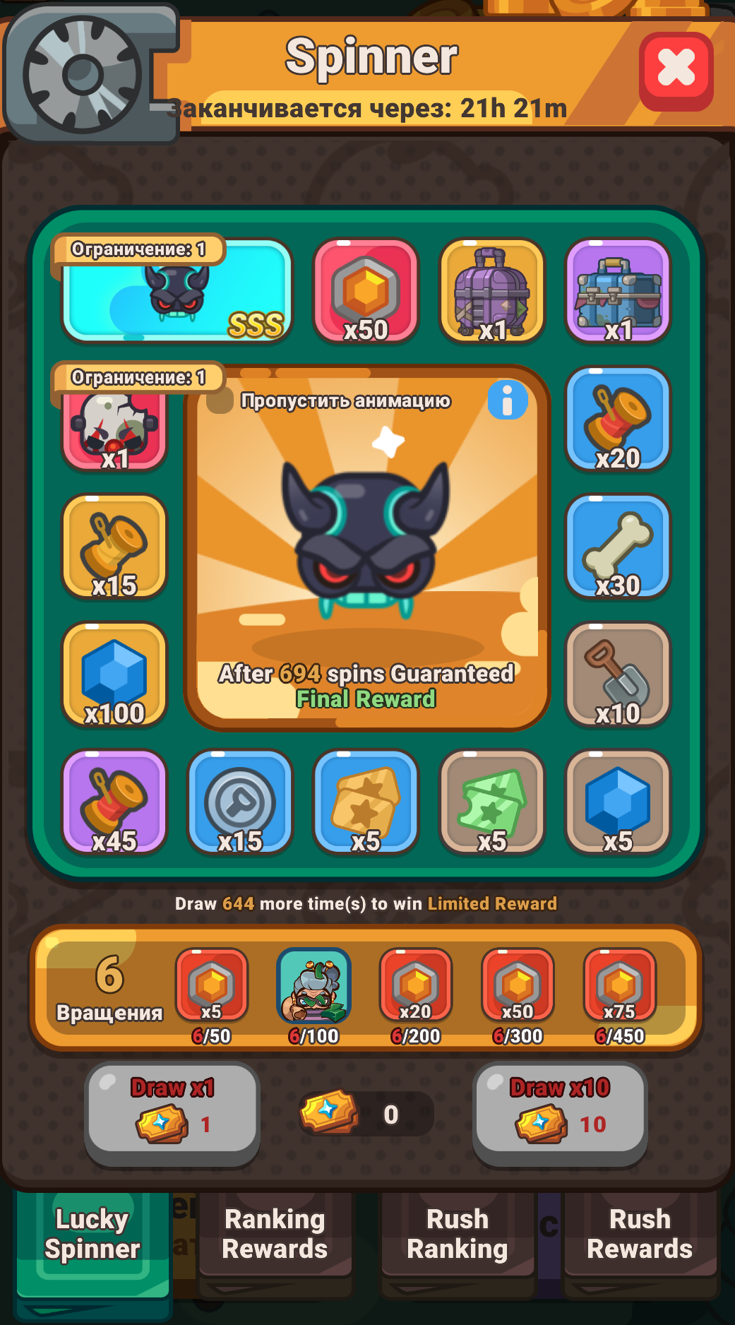 - Гарантия: финальный приз гарантирован после определенного числа вращений (это число индивидуально для каждого события).