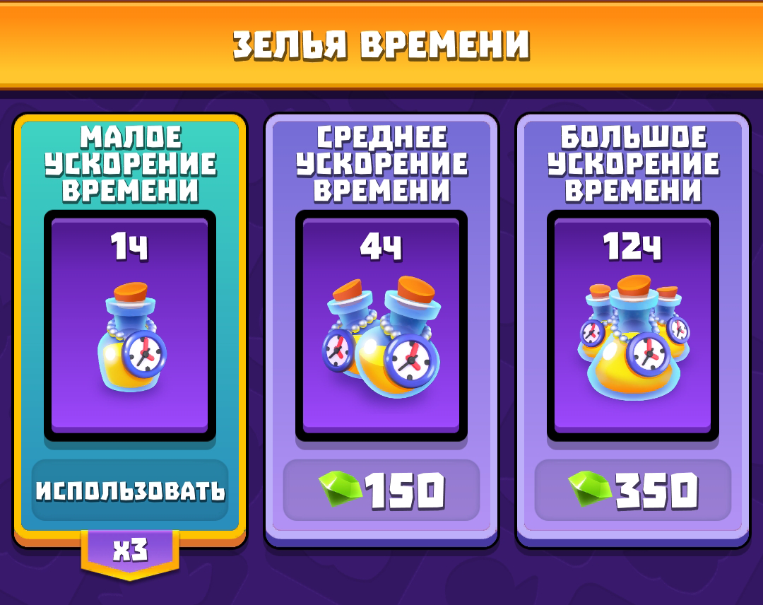 Чтобы воспользоваться зельями времени или купить новые, откройте внутриигровой Магазин (иконка сундука внизу экрана) и прокрути вниз до раздела «Зелья времени»: